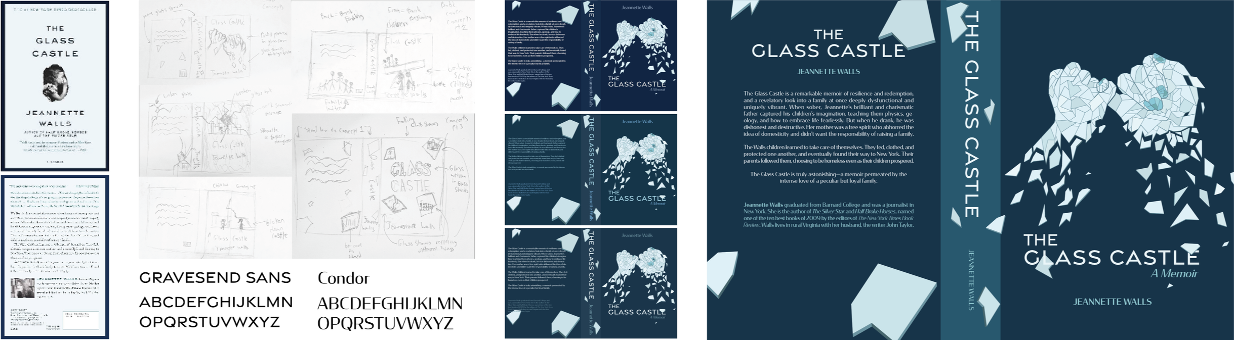 For this project, the objective was to take a book and redesign it’s cover with a design that is based on the story being told rather than using imagery related to the title. To do this, I chose to redesign Jeannette Walls memoir, “The Glass Castle”, taking concepts from the story and creating an abstract version of the events happening in the book.