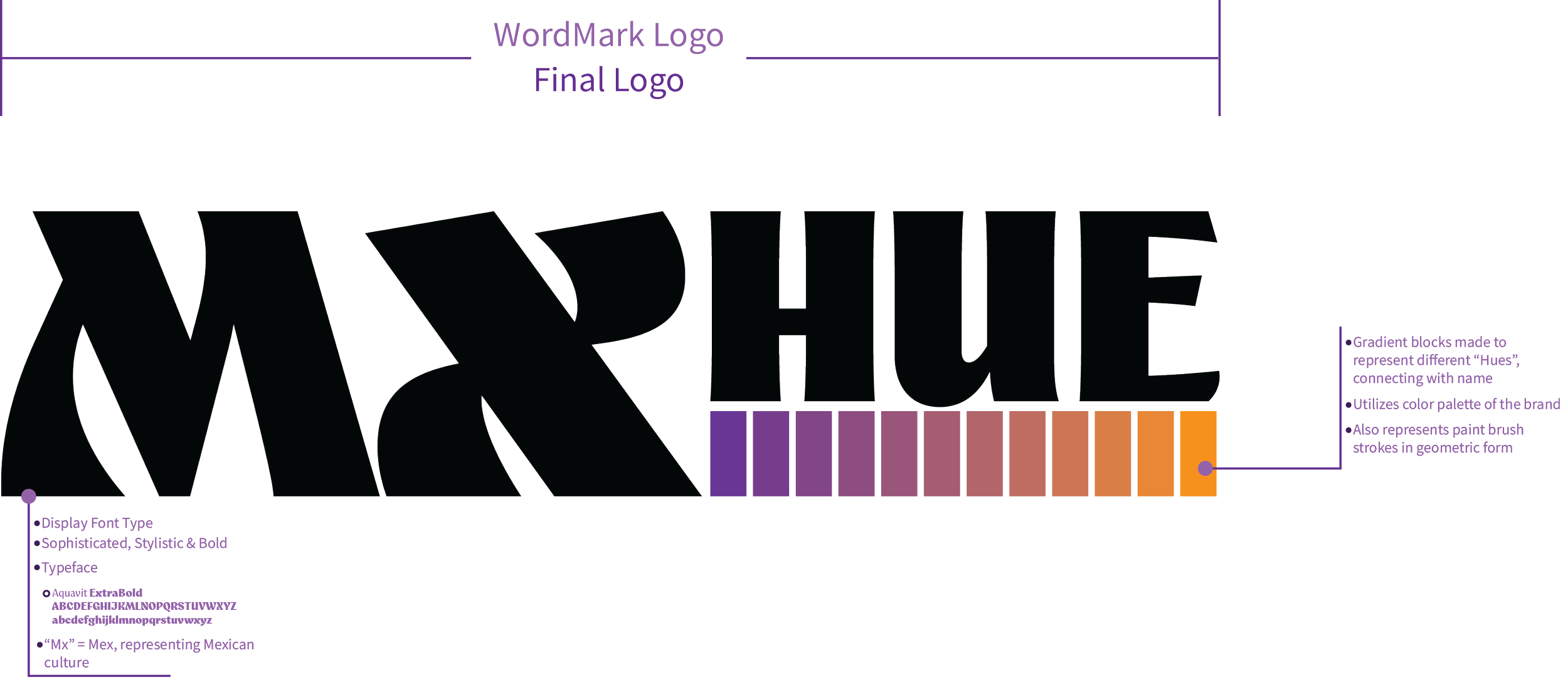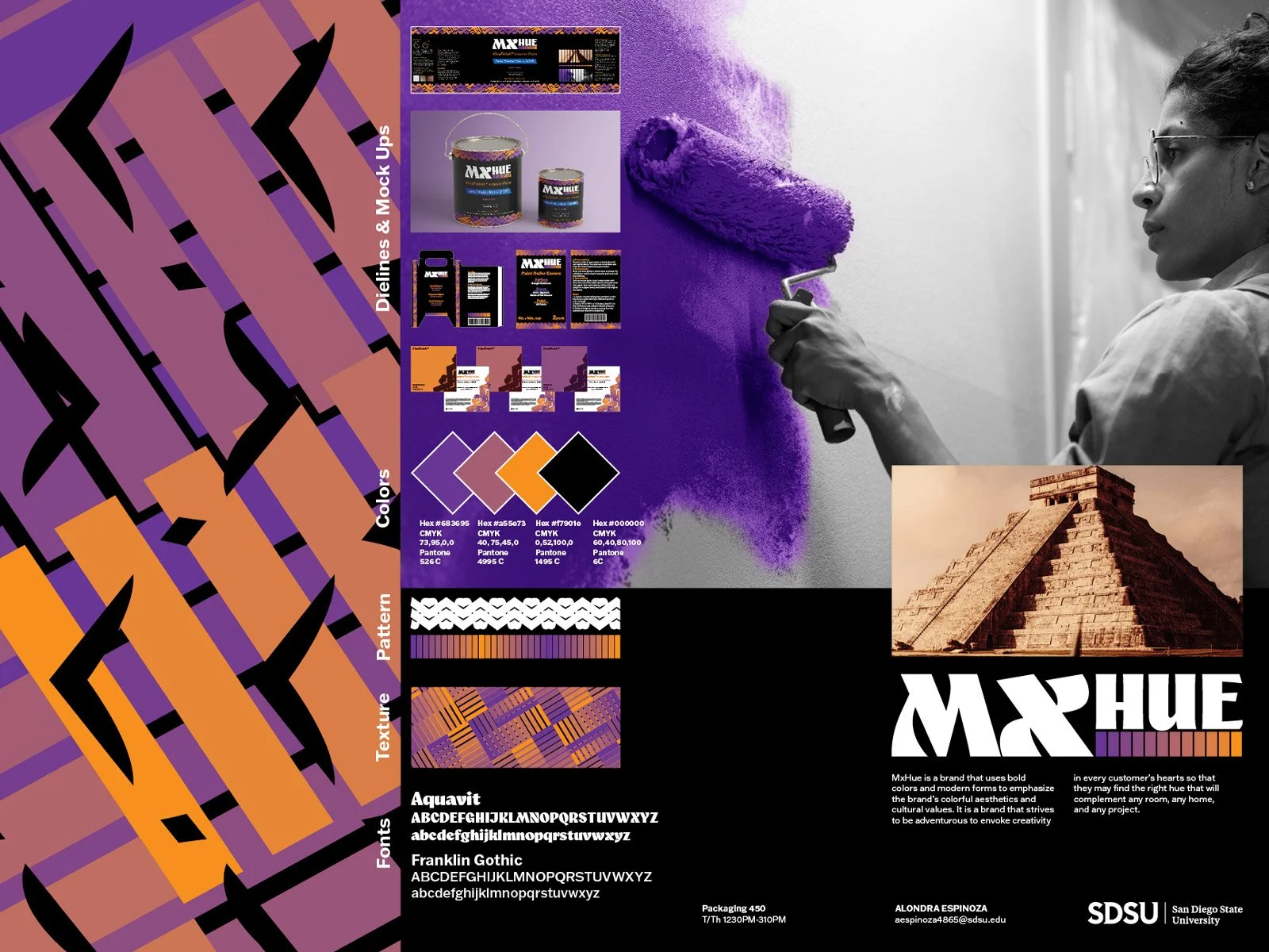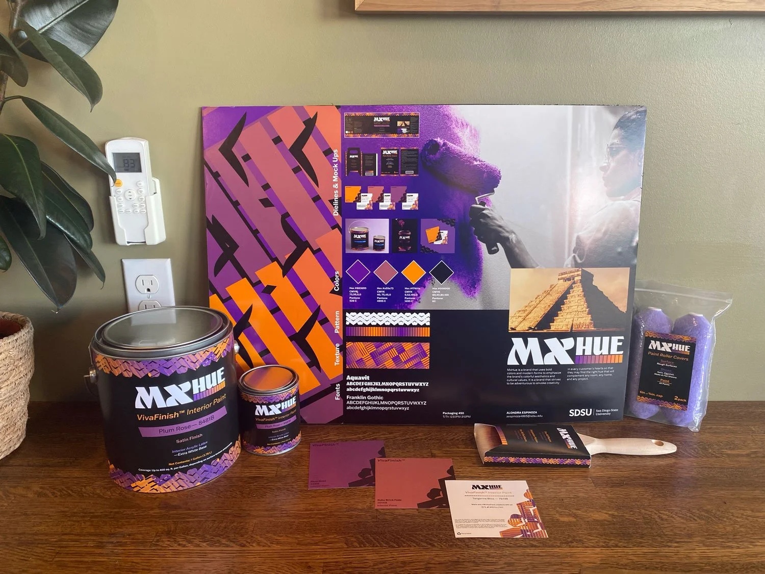 Through MxHue’s modern and simplistic logo design, bold use of colors with a black background, warm vibrant colors used to draw attention to the buckets’ labels, and it’s connection to hispanic culture, it is able to stand out in front of other competitors while also fulfilling the task at hand, which was to develop a paint brand that is modern, clear, durable, and consistent.