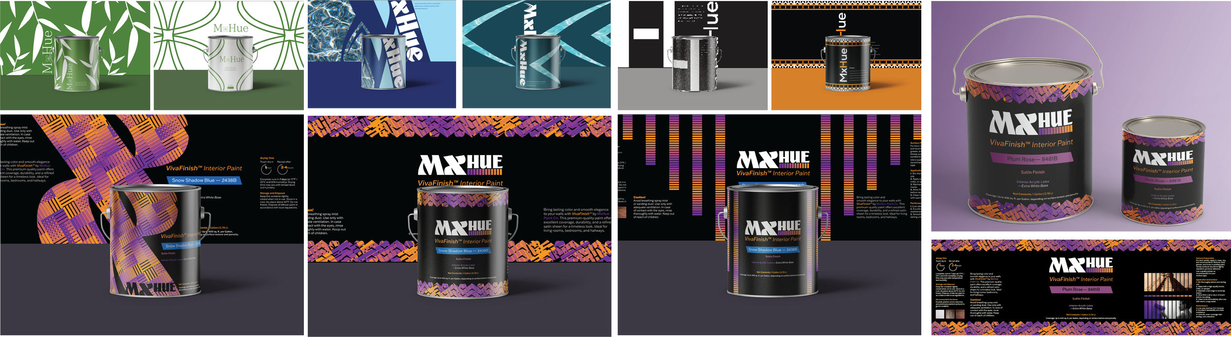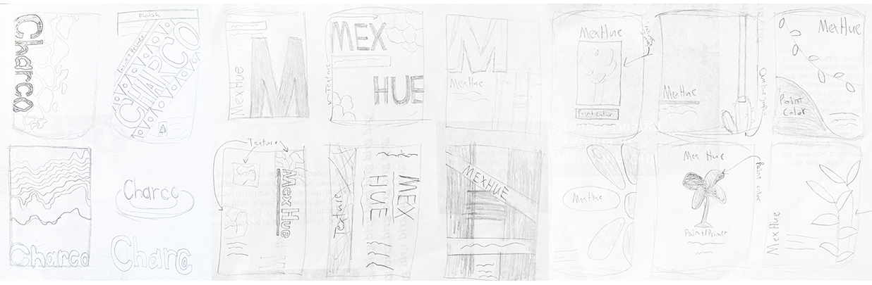 Just as with the logo options, I also considered several ideas for the paint can. Some minimalistic, others focused on typographic elements or graphics and textures. These were rough ideas that I aimed to explore. Some were earlier drafts with a different name for the paint brand, but I ultimately chose on the name, “MxHue” as it held a closer connection to paint and allowed for the inclusion of Mexican culture into the brand’s identity.